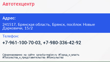 Автотехцентр по адресу 241517, Брянская область, Брянск, посёлок Новые Дарковичи, 15/2 в дальнейшем Организация, размещена в следующих категориях: