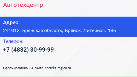 Автотехцентр по адресу 241012, Брянская область, Брянск, Литейная, 18Б в дальнейшем Организация, размещена в следующих категориях: