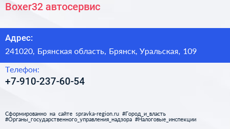 Boxer32, автосервис по адресу 241020, Брянская область, Брянск, Уральская, 109 в дальнейшем Организация, размещена в следующих категориях: