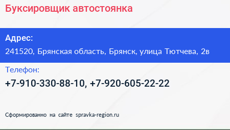 Буксировщик, автостоянка по адресу 241520, Брянская область, Брянск, улица Тютчева, 2в в дальнейшем Организация, размещена в следующих категориях: