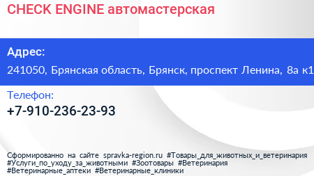 CHECK ENGINE, автомастерская по адресу 241050, Брянская область, Брянск, проспект Ленина, 8а к1 в дальнейшем Организация, размещена в следующих категориях: