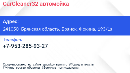 CarCleaner32, автомойка по адресу 241050, Брянская область, Брянск, Фокина, 193/1а в дальнейшем Организация, размещена в следующих категориях: