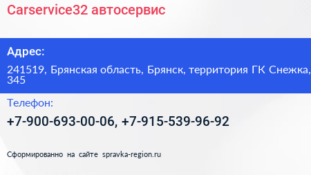 Carservice32, автосервис по адресу 241519, Брянская область, Брянск, территория ГК Снежка, 345 в дальнейшем Организация, размещена в следующих категориях: