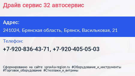 Драйв-сервис 32, автосервис по адресу 241024, Брянская область, Брянск, Васильковая, 21 в дальнейшем Организация, размещена в следующих категориях: