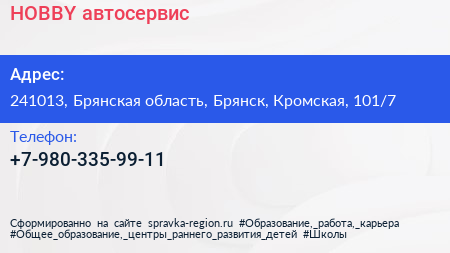 HOBBY, автосервис по адресу 241013, Брянская область, Брянск, Кромская, 101/7 в дальнейшем Организация, размещена в следующих категориях:
