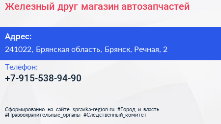 Железный друг, магазин автозапчастей по адресу 241022, Брянская область, Брянск, Речная, 2 в дальнейшем Организация, размещена в следующих категориях: