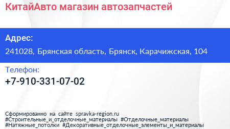 КитайАвто, магазин автозапчастей по адресу 241028, Брянская область, Брянск, Карачижская, 104 в дальнейшем Организация, размещена в следующих категориях:
