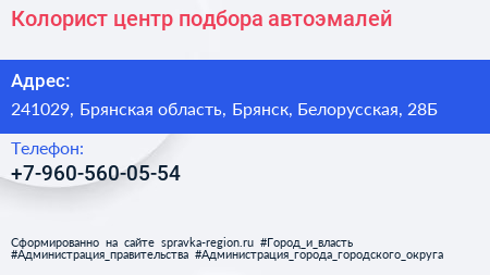 Колорист, центр подбора автоэмалей по адресу 241029, Брянская область, Брянск, Белорусская, 28Б в дальнейшем Организация, размещена в следующих категориях: