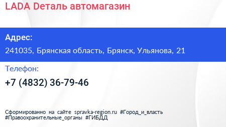 LADA Dеталь, автомагазин по адресу 241035, Брянская область, Брянск, Ульянова, 21 в дальнейшем Организация, размещена в следующих категориях: