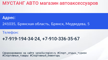 МУСТАНГ-АВТО, магазин автоаксессуаров по адресу 241035, Брянская область, Брянск, Медведева, 5 в дальнейшем Организация, размещена в следующих категориях: