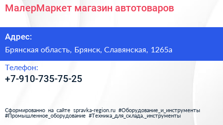 МалерМаркет, магазин автотоваров по адресу Брянская область, Брянск, Славянская, 1265а в дальнейшем Организация, размещена в следующих категориях:
