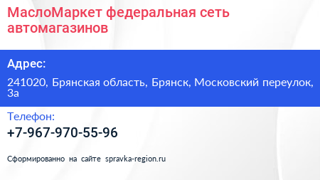 МаслоМаркет, федеральная сеть автомагазинов по адресу 241020, Брянская область, Брянск, Московский переулок, 3а в дальнейшем Организация, размещена в следующих категориях: