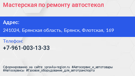 Мастерская по ремонту автостекол по адресу 241024, Брянская область, Брянск, Флотская, 169 в дальнейшем Организация, размещена в следующих категориях: