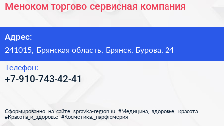 Меноком, торгово-сервисная компания по адресу 241015, Брянская область, Брянск, Бурова, 24 в дальнейшем Организация, размещена в следующих категориях: