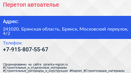 Перетоп, автоателье по адресу 241020, Брянская область, Брянск, Московский переулок, 4/2 в дальнейшем Организация, размещена в следующих категориях: