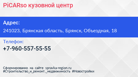 PiCARso, кузовной центр по адресу 241023, Брянская область, Брянск, Объездная, 18 в дальнейшем Организация, размещена в следующих категориях: