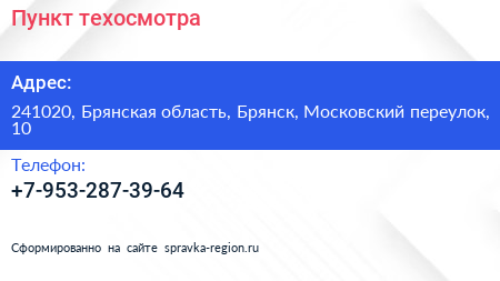 Пункт техосмотра по адресу 241020, Брянская область, Брянск, Московский переулок, 10 в дальнейшем Организация, размещена в следующих категориях: