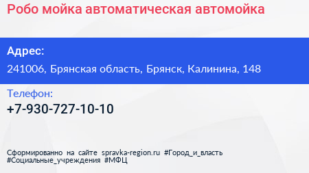 Робо мойка, автоматическая автомойка по адресу 241006, Брянская область, Брянск, Калинина, 148 в дальнейшем Организация, размещена в следующих категориях: