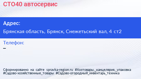 СТО40, автосервис по адресу Брянская область, Брянск, Снежетьский вал, 4 ст2 в дальнейшем Организация, размещена в следующих категориях: