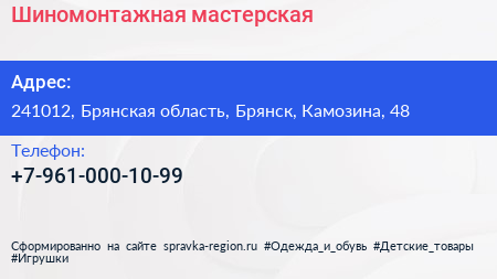 Шиномонтажная мастерская по адресу 241012, Брянская область, Брянск, Камозина, 48 в дальнейшем Организация, размещена в следующих категориях: