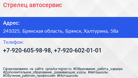 Стрелец, автосервис по адресу 241025, Брянская область, Брянск, Халтурина, 58а в дальнейшем Организация, размещена в следующих категориях:
