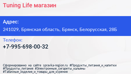 Tuning Life, магазин по адресу 241029, Брянская область, Брянск, Белорусская, 28Б в дальнейшем Организация, размещена в следующих категориях: