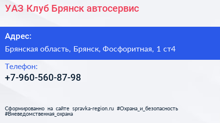 УАЗ Клуб Брянск, автосервис по адресу Брянская область, Брянск, Фосфоритная, 1 ст4 в дальнейшем Организация, размещена в следующих категориях: