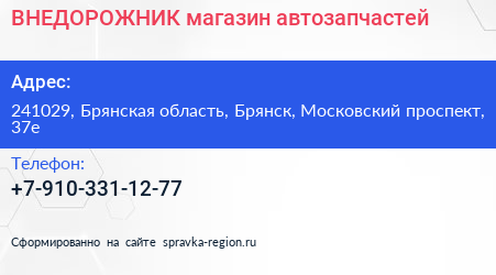 ВНЕДОРОЖНИК, магазин автозапчастей по адресу 241029, Брянская область, Брянск, Московский проспект, 37е в дальнейшем Организация, размещена в следующих категориях:
