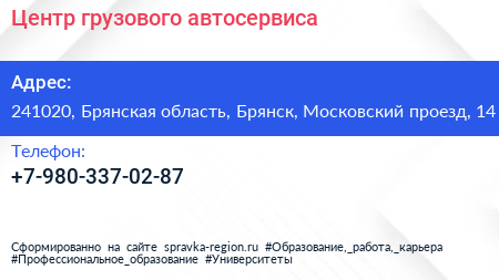 Центр грузового автосервиса по адресу 241020, Брянская область, Брянск, Московский проезд, 14 в дальнейшем Организация, размещена в следующих категориях: