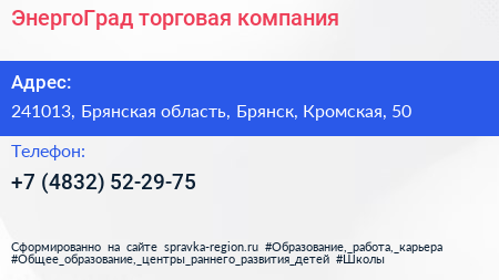 ЭнергоГрад, торговая компания по адресу 241013, Брянская область, Брянск, Кромская, 50 в дальнейшем Организация, размещена в следующих категориях: