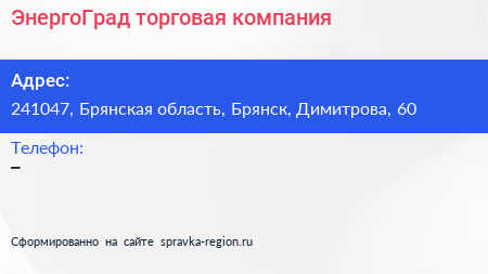 ЭнергоГрад, торговая компания по адресу 241047, Брянская область, Брянск, Димитрова, 60 в дальнейшем Организация, размещена в следующих категориях: