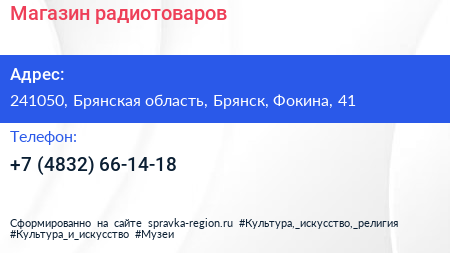 Магазин радиотоваров по адресу 241050, Брянская область, Брянск, Фокина, 41 в дальнейшем Организация, размещена в следующих категориях: