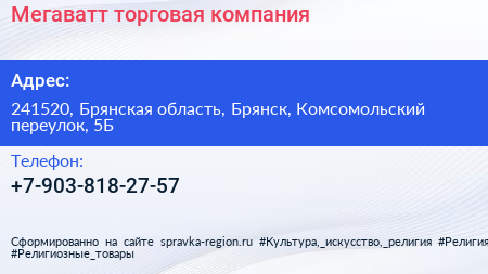 Мегаватт, торговая компания по адресу 241520, Брянская область, Брянск, Комсомольский переулок, 5Б в дальнейшем Организация, размещена в следующих категориях: