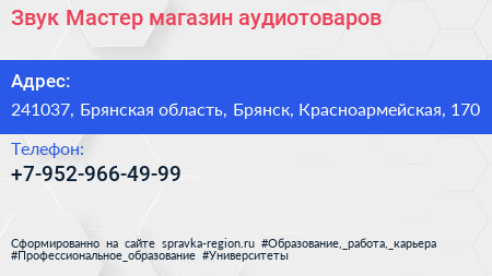 Звук Мастер, магазин аудиотоваров по адресу 241037, Брянская область, Брянск, Красноармейская, 170 в дальнейшем Организация, размещена в следующих категориях: