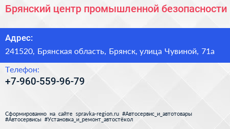 Брянский центр промышленной безопасности по адресу 241520, Брянская область, Брянск, улица Чувиной, 71а в дальнейшем Организация, размещена в следующих категориях: