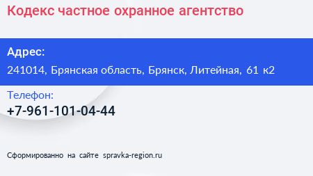 Кодекс, частное охранное агентство по адресу 241014, Брянская область, Брянск, Литейная, 61 к2 в дальнейшем Организация, размещена в следующих категориях: