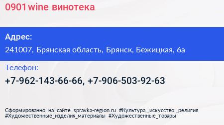 0901 wine, винотека по адресу 241007, Брянская область, Брянск, Бежицкая, 6а в дальнейшем Организация, размещена в следующих категориях: