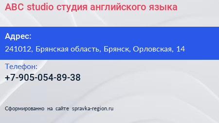 ABC-studio, студия английского языка по адресу 241012, Брянская область, Брянск, Орловская, 14 в дальнейшем Организация, размещена в следующих категориях: