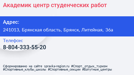Академик, центр студенческих работ по адресу 241013, Брянская область, Брянск, Литейная, 36а в дальнейшем Организация, размещена в следующих категориях: