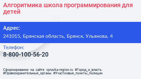 Алгоритмика, школа программирования для детей по адресу 241015, Брянская область, Брянск, Ульянова, 4 в дальнейшем Организация, размещена в следующих категориях: