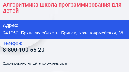 Алгоритмика, школа программирования для детей по адресу 241050, Брянская область, Брянск, Красноармейская, 39 в дальнейшем Организация, размещена в следующих категориях:
