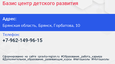 Базис, центр детского развития по адресу Брянская область, Брянск, Горбатова, 10 в дальнейшем Организация, размещена в следующих категориях: