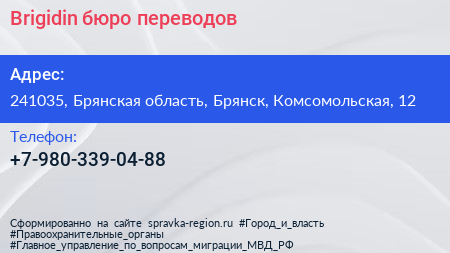Brigidin, бюро переводов по адресу 241035, Брянская область, Брянск, Комсомольская, 12 в дальнейшем Организация, размещена в следующих категориях: