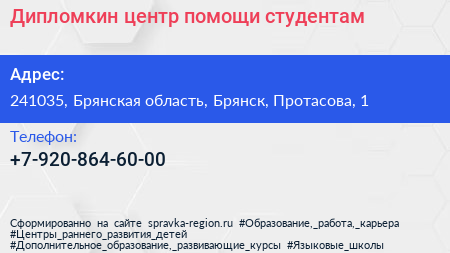 Дипломкин, центр помощи студентам по адресу 241035, Брянская область, Брянск, Протасова, 1 в дальнейшем Организация, размещена в следующих категориях: