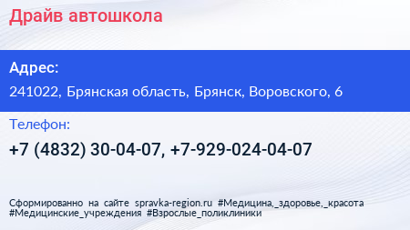 Драйв, автошкола по адресу 241022, Брянская область, Брянск, Воровского, 6 в дальнейшем Организация, размещена в следующих категориях: