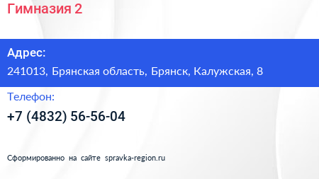 Гимназия №2 по адресу 241013, Брянская область, Брянск, Калужская, 8 в дальнейшем Организация, размещена в следующих категориях: