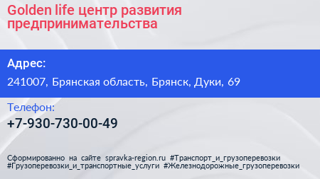 Golden life, центр развития предпринимательства по адресу 241007, Брянская область, Брянск, Дуки, 69 в дальнейшем Организация, размещена в следующих категориях: