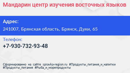 Мандарин, центр изучения восточных языков по адресу 241007, Брянская область, Брянск, Дуки, 65 в дальнейшем Организация, размещена в следующих категориях:
