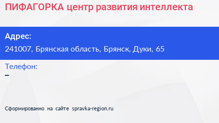 ПИФАГОРКА, центр развития интеллекта по адресу 241007, Брянская область, Брянск, Дуки, 65 в дальнейшем Организация, размещена в следующих категориях: