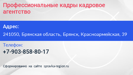 Профессиональные кадры, кадровое агентство по адресу 241050, Брянская область, Брянск, Красноармейская, 39 в дальнейшем Организация, размещена в следующих категориях: